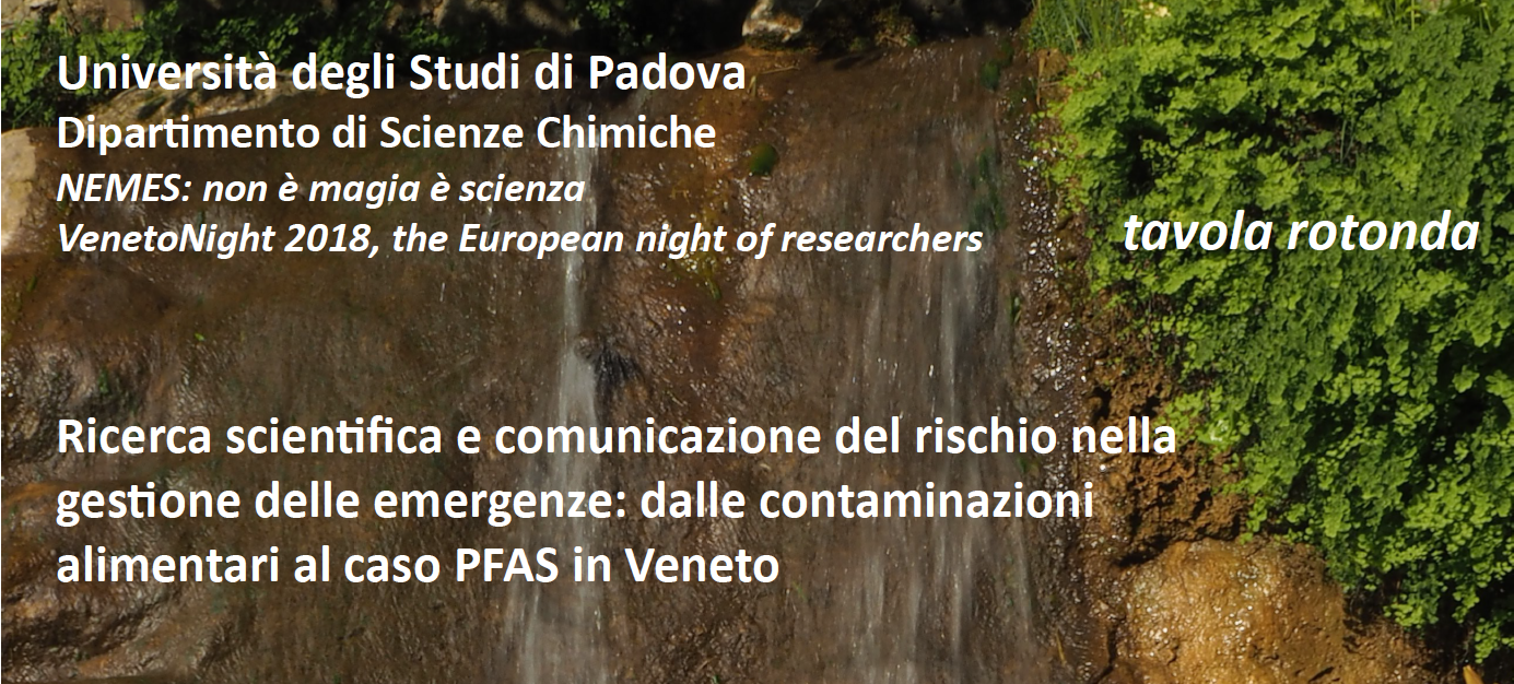 Venerdì 28 settembre 2018, presso l’Università degli Studi di Padova, si terrà la tavola rotonda “Ricerca scientifica e comunicazione del rischio nella gestione delle emergenze: dalle contaminazioni alimentari al caso PFAS in Veneto”. La conferenza è uno degli eventi della VenetoNight2018 – Notte europea dei ricercatori.