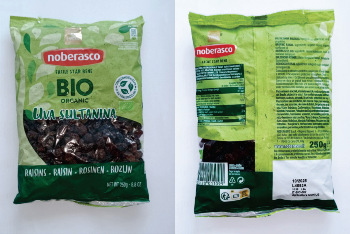 I supermercati Decò e la catena dm hanno segnalato il richiamo da parte del produttore di un lotto di uvetta sultanina biologica a marchio Noberasco. Il motivo indicato sull’avviso di richiamo è la presenza del principio attivo clorpirifos, un pesticida organofosfato vietato in Unione Europea. Il prodotto è venduto in confezioni da 250 grammi, con il numero di lotto L4093A e il termine minimo di conservazione (TMC) 10/2025.