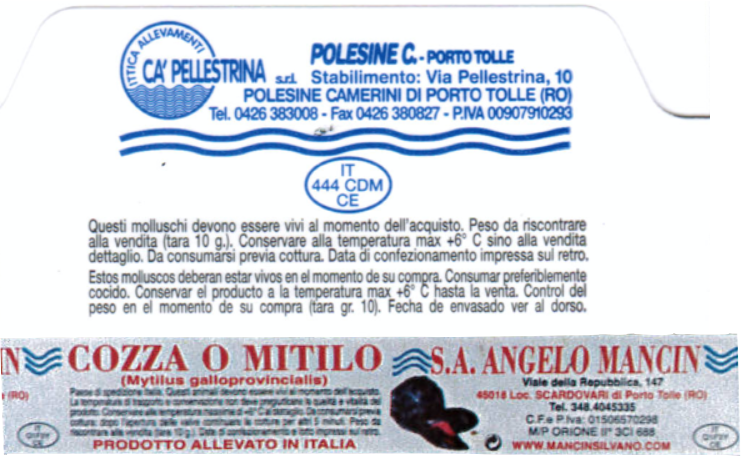 Le cozze richiamate sono state prodotte da Ittica Allevamenti Ca’ Pellestrina nello stabilimento di via Pellestrina 10 a Porto Tolle, in provincia di Rovigo (IT 444 CDM CE) e dalla Società Agricola Angelo Mancin nell’impianto di viale della Repubblica 147, in località Scardovari, sempre a Porto Tolle (IT Q1F3Y CE).