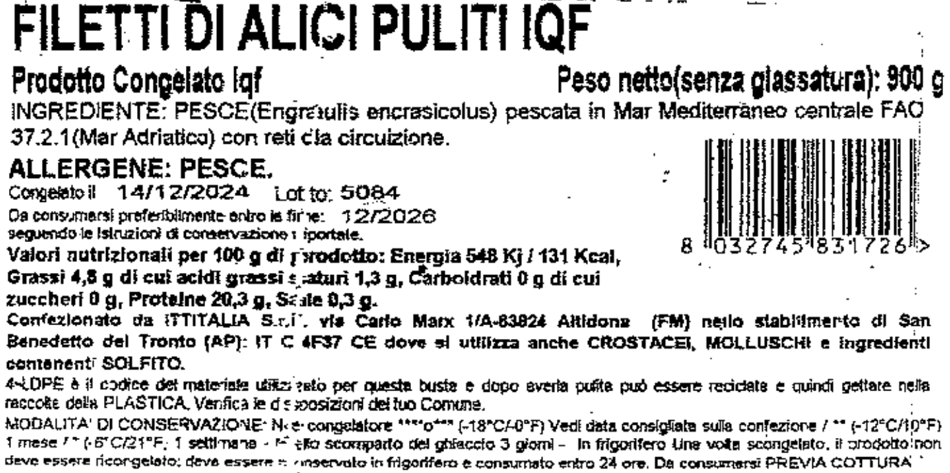 Il Ministero ha pubblicato anche il richiamo da parte dell’operatore di un lotto di filetti di filetti di alici puliti e congelati a marchio Ittitalia. Il motivo indicato sull’avviso di richiamo, anche in questo caso, è la presenza di istamina oltre i limiti. Il prodotto coinvolto è venduto in confezioni da 900 grammi, con il numero di lotto 5084 e il TMC 12/2026.