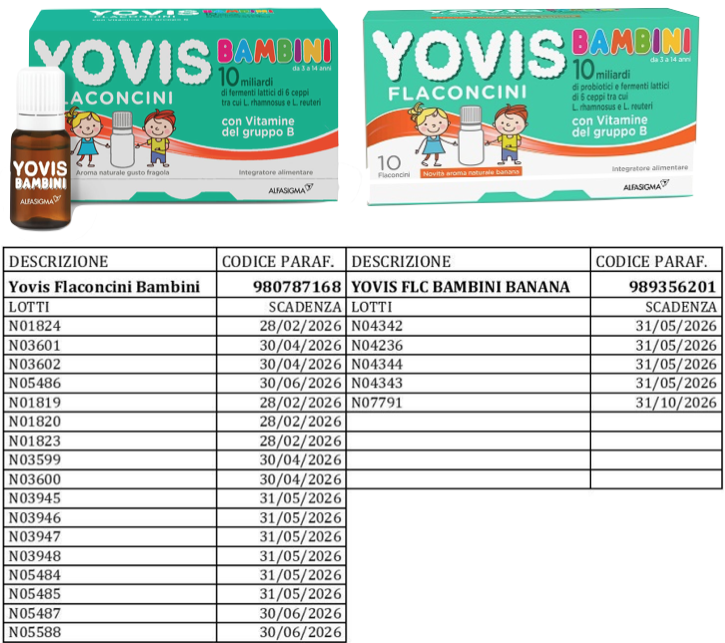 Il Ministero della Salute ha diffuso il richiamo precauzionale di diversi lotti dei fermenti lattici Yovis bambini gusto fragola e gusto banana, in seguito ad alcune segnalazioni di effetti indesiderati. Il prodotto in questione è venduto in confezioni da 10 flaconcini da 10 ml, con i seguenti numeri di lotto e scadenze: