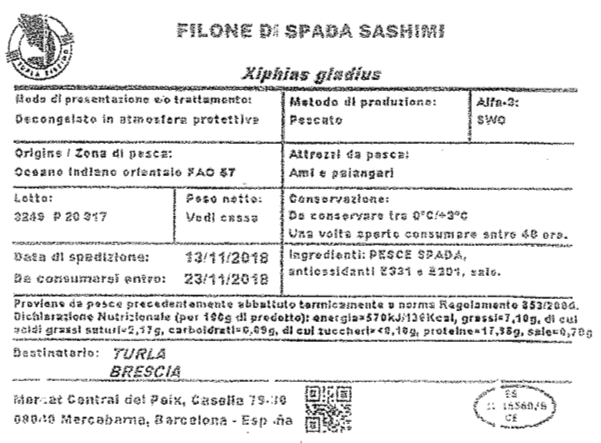 Il filone di pesce spada interessato era stato prodotto per Ittica di Franciacorta Srl da Frime SA, nello stabilimento di Mercabrina, in Spagna (marchio di identificazione ES 12 16560/B CE).