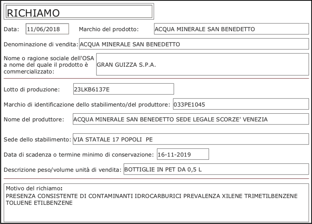 Il ministero della Salute oggi ha dato notizia del richiamo di un lotto di acqua minerale San Benedetto “Parco della Majella” della Fonte Primavera, per la “presenza consistente di contaminanti idrocarburici”. Nel comunicato sono indicate sostanze come: xilene, etilbenzene, trimetilbenzene e toluene. L’Agenzia internazionale per la ricerca sul cancro (Iarc) inserisce l’etilbenzene nel gruppo 2B delle sostanze “possibilmente cancerogene per l’uomo” e la “presenza consistente” evidenziata nel comunicato desta più di una legittima preoccupazione.
