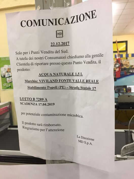 MD Discount ha richiamato un lotto di acqua naturale a marchio Viviland Fonte Valle Reale per potenziale contaminazione microbiologica. Sono interessate al provvedimento le confezioni da 1,5 litri di acqua naturale, imbottigliate nello stabilimento di Popoli (provincia di Pescara), che fanno parte del lotto di produzione B7289A con scadenza al 17/04/2019.