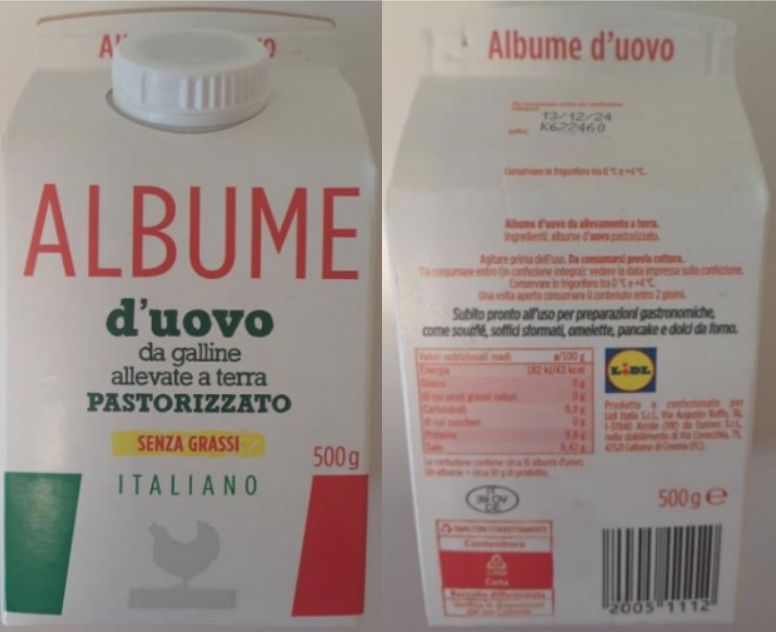Il Ministero della Salute ha segnalato il richiamo da parte dell’operatore di un lotto di albume d’uovo da galline allevate a terra pastorizzato a marchio Lidl. Il motivo indicato nell’avviso di richiamo è la presenza di Salmonella spp nel prodotto. Le confezioni interessate sono quelle da 500 grammi, con il numero di lotto K 622460 e la data di scadenza 13/12/2024.