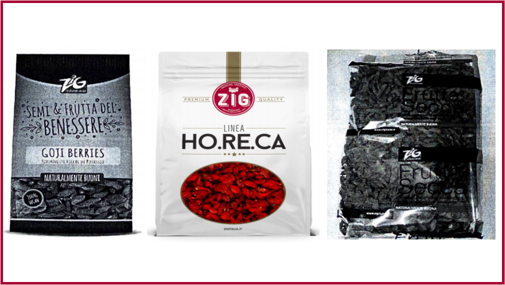 - Bacche di goji Zig Linea Ho.Re.Ca in confezione da 1 kg (scatole da 8 pezzi), con i numeri di lotto 19/354, 20/10, 20/36, 20/44, 20/63 e 20/77 (nessun Tmc indicato).