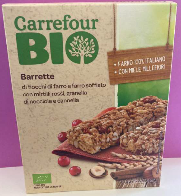 I supermercati Carrefour hanno richiamato un lotto di barrette di fiocchi di farro e farro soffiato con mirtilli rossi, granella di nocciole e cannella a marchio Carrefour Bio perché è stata riscontrata la presenza di solfiti (23 +/- 6 mg/kg) non dichiarati in etichetta. Il prodotto in questione è venduto in scatole da 125 grammi (5×25 grammi) con il numero di lotto 1812 e il termine minimo di conservazione (Tmc) 23/12/2023.