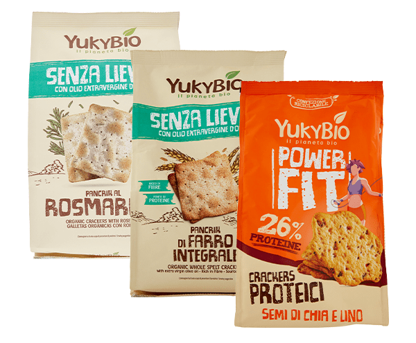 - Crackers proteici semi di chia e lino Power Fit Yukibio, in confezioni da 200 grammi, con il numero di lotto 310 C 23 e il TMC 18/10/2024;