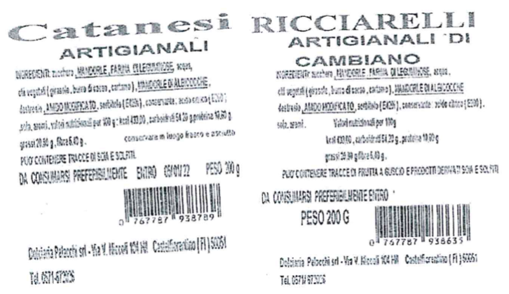 - Catanesi artigianali Dolciaria Pelacchi, in confezioni da 200 grammi, con i numeri di lotto L180121, L110221, L090321, L230421, L100521 e L090621 e i termini minimi di conservazione (Tmc) 18/07/2021, 11/08/2021, 09/09/2021, 23/10/2021, 10/11/2021 e 09/12/2021.