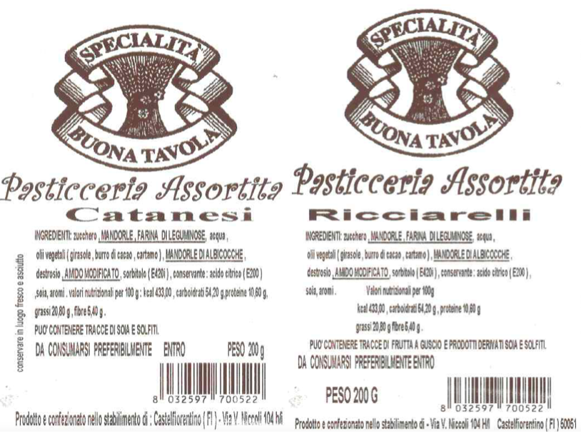 Aggiornamento del 13 dicembre 2021: Il ministero della Salute ha pubblicato la revoca per scadenza prodotto dei dolci catanesi e ricciarelli a marchio Specialità Buona Tavola, dei ricciarelli a marchio Sapori Artigianali, e dei catanesi e ricciarelli a marchio Dolciaria Pelacchi.