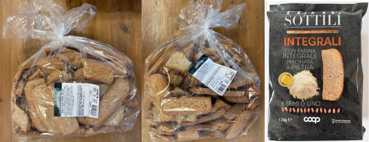 - Fette biscottate con farina integrale ritagli La Frumenteria, in sacchetti da 1 kg circa, con 16D25, 17D25 e 30D25 e il TMC 04/2026, e il numero di lotto 12E25 e il TMC 05/2026;