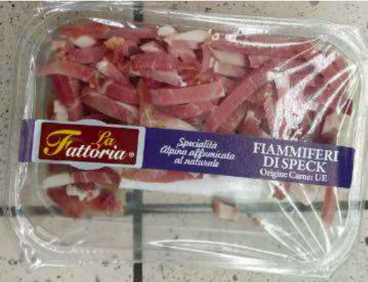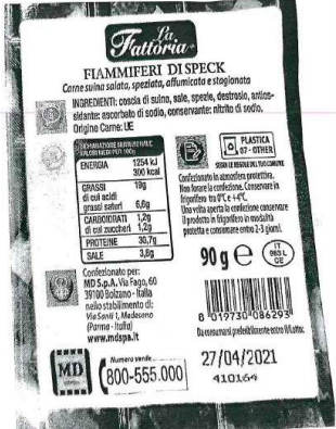 Il ministero della Salute ha diffuso il richiamo precauzionale di un lotto di fiammiferi di speck a marchio La Fattoria di MD per la “sospetta presenza di Listeria monocytogenes”. Il prodotto interessato è venduto in confezioni da 90 grammi con il numero di lotto 410164 e la data di scadenza 27/04/2021.