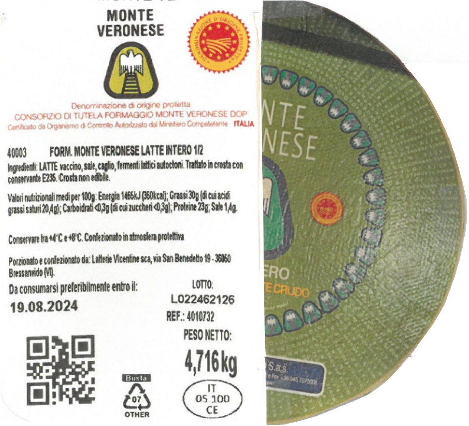 - Inoltre, è importante specificare che il formaggio richiamato è stato prodotto da un altro caseificio e commercializzato per un’importante catena della GDO. Latterie Vicentine non acquista né vende il Monte Veronese (aggiornamento del 18/07/2024).