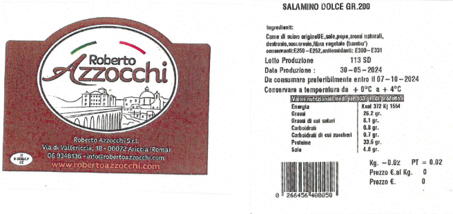 L’azienda Azzocchi Roberto Srl ha prodotto il salamino dolce richiamato. Lo stabilimento di produzione si trova in via Vallericcia 18, ad Ariccia, nella città metropolitana di Roma Capitale (marchio di identificazione CE IT 9 2506 LP).