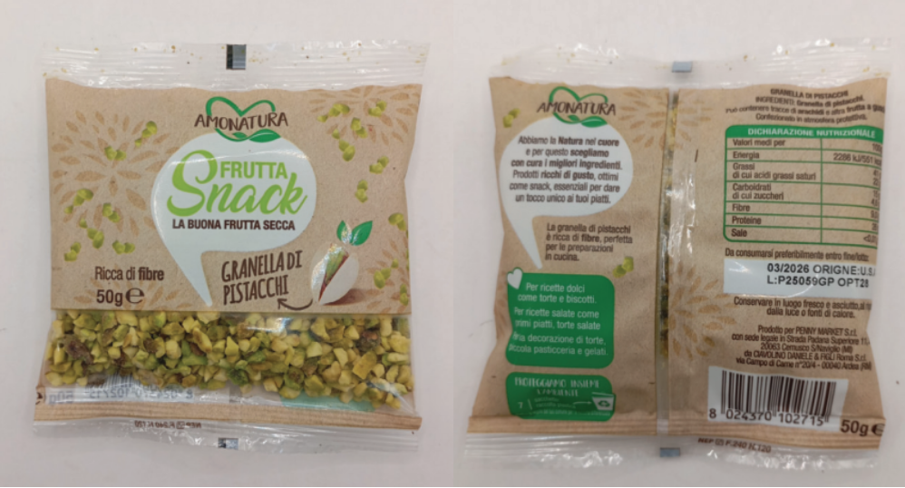 Penny Market e il suo fornitore hanno richiamato un lotto di granella di pistacchi Amonatura, marchio della catena di discount. Il motivo indicato sull’avviso di richiamo è la presenza di livelli di ocratossina A superiori ai limiti di legge. Il prodotto in questione è venduto in sacchetti da 50 grammi, con il numero di lotto P25059GP e il termine minimo di conservazione (TMC) 03/2026. Anche il Ministero della Salute ha segnalato il provvedimento (aggiornamento del 09/05/2025).