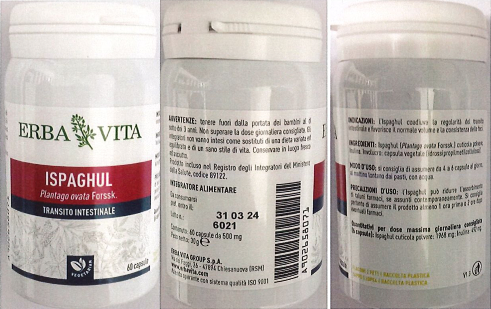 - Ispaghul, integratore alimentare in confezione da 60 capsule da 500 mg (peso netto 30 grammi), con il numero di lotto 6021 e il termine minimo di conservazione (Tmc) 31/03/2024