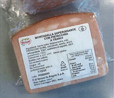 - Mortadella supergigante con pistacchio a tranci Veroni distribuita da Rialto con i numeri di lotto P02223101, P02223801, P02223802 e P02224401 e i Tmc 13/11/2022, 20/11/2022, 26/11/2022 e 07/12/2022;