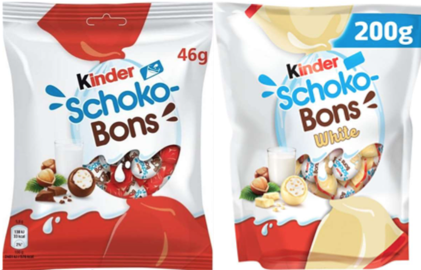 - Kinder Schoko-Bons, in formato da 46 g, 125 g, 200 g, 300 g, 350 g, 500 g e 750 g, e Kinder Schoko-Bons White, in formato da 200 g e 300 g, con tutti i numeri di lotto e Tmc;