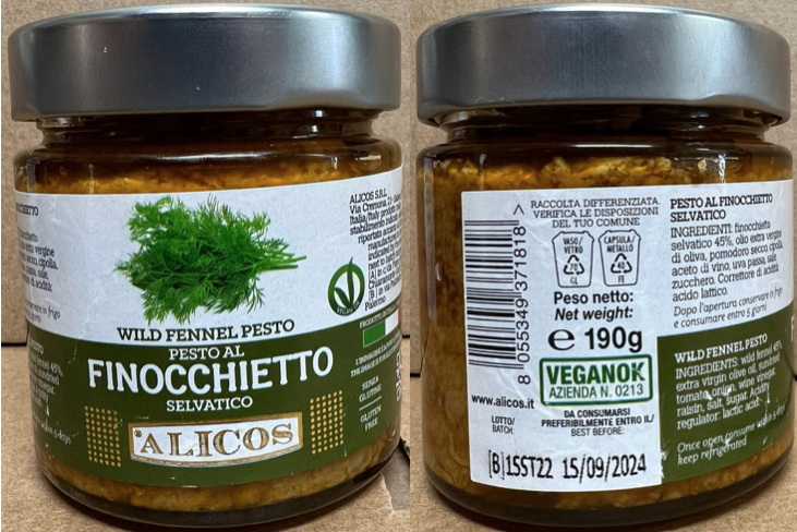 Il ministero della Salute ed Eataly hanno segnalato anche il richiamo precauzionale da parte del produttore di un lotto di pesto di finocchietto selvatico a marchio Alicos perché sussiste il rischio grave di una potenziale proliferazione di flora batterica pericolosa (Clostridium botulinum) dovuta un non corretta acidificazione del prodotto. I vasetti interessati sono quelli da 190 grammi con il numero di lotto 15ST22 e il termine minimo di conservazione (Tmc) 15/09/2024.