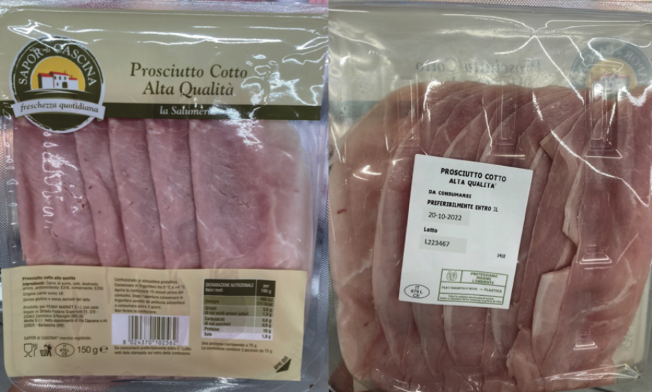 Penny Market ha segnalato il richiamo precauzionale da parte del produttore di un lotto di prosciutto cotto alta qualità del suo marchio Sapor di Cascina per la possibile presenza di Listeria monocytogenes. Il prodotto in questione è venduto in vaschette da 150 grammi con il numero di lotto 223467 e il termine minimo di conservazione (Tmc) 20/10/2022. Il provvedimento è stato pubblicato anche dal ministero della Salute, ma soltanto il 18 ottobre, a due giorni dalla scadenza del prodotto (aggiornamento del 18 ottobre 2022).
