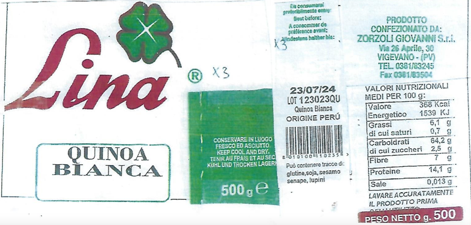 La quinoa richiamata è stata prodotta dall’azienda Agritrade Sac in Perù ed è stata confezionata da Zorzoli Giovanni Srl, nello stabilimento di via 26 Aprile 30, a Vigevano, in provincia di Pavia.
