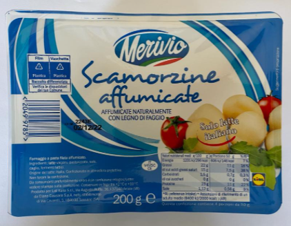 Il ministero della Salute ha segnalato il richiamo precauzionale da parte del produttore di un lotto di scamorzine affumicate con i marchi Merivio di Lidl e Scerì per la possibile presenza di corpi estranei di natura plastica. Entrambi i prodotti interessati sono venduto in confezioni da 200 grammi, con il numero di lotto 2243E e le date di scadenza 02/12/2022 (marchio Merivio) e 04/12/2022 (marchio Scerì).