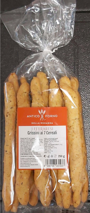 Il ministero della Salute, invece, ha pubblicato il richiamo precauzionale di alcuni lotti di grissini ai 7 cereali I Ferraresi a marchio Antico Forno della Romagna, per la presenza di ossido di etilene in concentrazione superiore ai limiti di legge nei semi di sesamo contenuti in un semilavorato usato durante la produzione. Il prodotto interessato è distribuito in sacchetti da 250 grammi con i numeri di lotto 2046 e Tmc 11/04/2021, 2047 e Tmc 20/04/2021, 2048 e Tmc 26/04/2021, 2049 e Tmc 30/04/2021.
