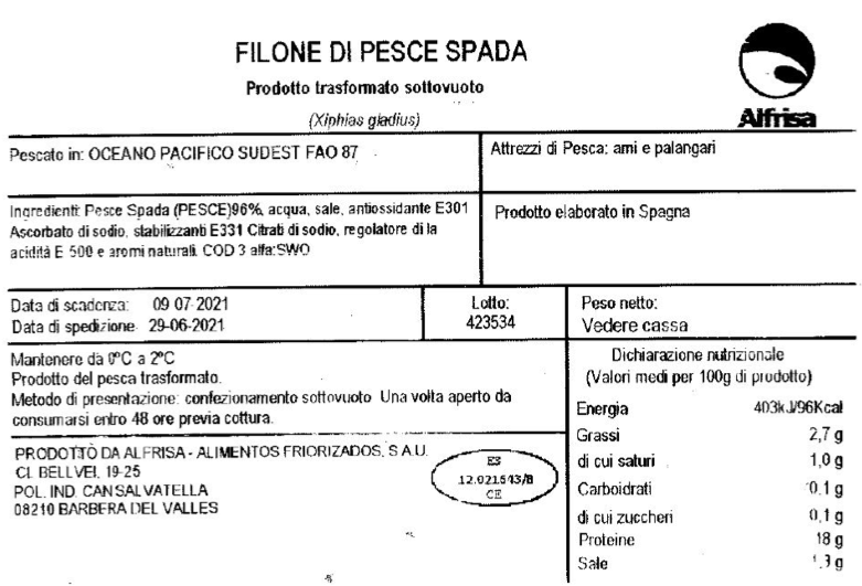 - Filone di pesce spada decongelato (Xiphias gladius) a marchio Alfrisa con il numero di lotto 423534 e scadenza 09/07/2021 prodotto da Alimentos Friorizados Sau, Barberà del Vallès, a Barcellona, in Spagna e commercializzato da Eurofish Napoli srl, venduto nelle pescherie dei Cash dal 01/07/2021 al 09/07/2021.