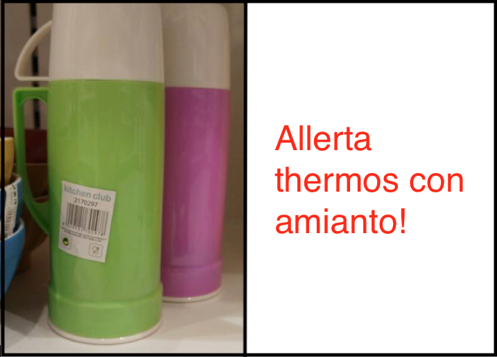 Il Ministero della salute ha lanciato una nuova allerta per la presenza sul mercato di thermos di provenienza cinese contenenti amianto. Il problema dei thermos con all’interno pasticche di amianto non è nuovo. Il Ministero aveva proceduto al ritiro dal mercato di dieci marche  nel mese di ottobre del 2014,  poi nel 2015 e anche all’inizio del 2016 come avevamo documentato. Il prodotto al centro di questa nuova allerta è il thermos porta pranzo da 0,35 litri a marchio Kitchen Club (articolo 2170297, codice a barre 8-029121702978) con esterno in plastica di colori vari. I thermos sono stati importati dalla Cina e distribuiti in Italia dall’azienda Galileo Spa, con sede in strada Galli 27 nella frazione Villa Adriana di Tivoli, e scoperti nel punto vendita di proprietà della Società La Satur Srl in corso Martiri della Libertà 9 a Brescia.