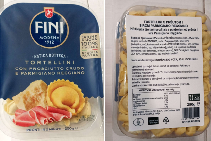 I supermercati Il Gigante e Carrefour hanno pubblicato il richiamo da parte del produttore di un lotto di tortellini prosciutto crudo e parmigiano reggiano a marchio Fini (aggiornamento del 23/09/2025). Il motivo indicato sull’avviso di richiamo la presenza, per errore, dell’etichettatura in lingua croata invece che in italiano. Il prodotto in questione è venduto in confezioni da 250 grammi con il numero di lotto BL3252R e la data di scadenza 14/11/2025. Anche il Ministero della Salute ha segnalato il provvedimento, pubblicandolo erroneamente nella sezione revoche e con quasi una settimana di ritardo (aggiornamento del 25/09/2025).