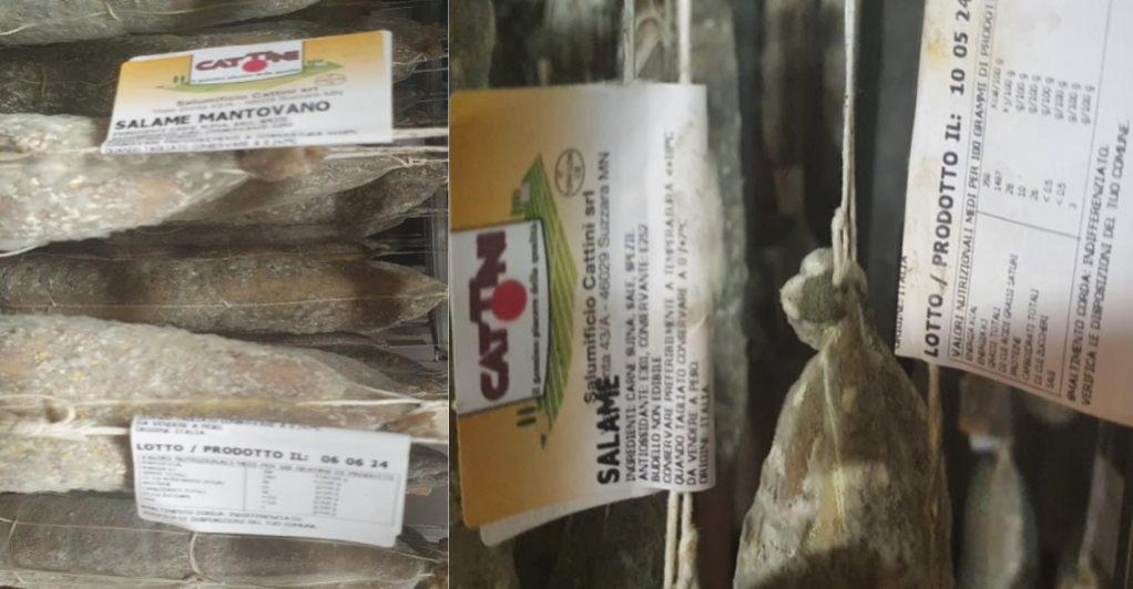 - Salame mantovano, in pezzi interi da 1,2 kg con i numeri di lotto 06 06 24 e 03 05 24, corrispondenti alle date di produzione;