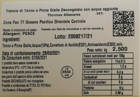 Aggiornamento del 7 giugno 2021: anche Sogegross ha segnalato il richiamo precauzionale del lotto di tonno a pinne gialle decongelato in tranci prodotto da Ittica Zu Pietro Srl e fornito da 4th Cliff Lobster Italia Srl. La catena specifica che il prodotto è stato venduto nei Cash & Carry Sogegross dal 01/06/2021 al 03/06/2021.Il ministero della Salute ha pubblicato il richiamo precauzionale da parte del produttore di un lotto di tranci di tonno a pinne gialle decongelato con acqua aggiunta a marchio Ittica Zu Pietro per rischio chimico. Il prodotto interessato è venduto in confezioni sottovuoto a peso variabile con il numero di lotto 2008217/21 e la data di scadenza 07/06/2021.