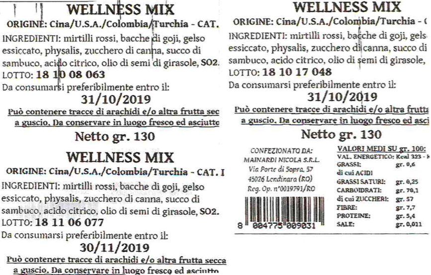 - Wellness mix in vassoio da 130 grammi: lotti numero 18 10 08 063, 18 10 17 048 e 18 11 06 077 con Tmc 31/10/2019 e 30/11/2019
