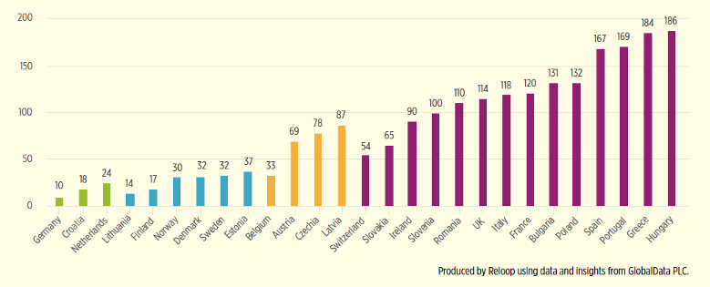 Se consideriamo la quantità di contenitori per bevande sprecati ogni anno, otteniamo una classifica in cui il Paese più virtuoso è la Germania, dove sono attivi sia sistemi di deposito su cauzione che di ricarica dei vuoti. Lo spreco maggiore si registra in nazioni come l’Ungheria e la Grecia dove non sono attivi né sistemi di ricarica dei vuoti, né di deposito su cauzione (come l’Italia). E i numeri sono molto diversi: in Ungheria ogni anno si sprecano 186 contenitori per bevande a testa e in Germania 10 (vedi grafico). Nelle nazioni che non mettono in atto questi sistemi lo spreco arriva a essere 18 volte superiore a quello della Germania. La Lituania, dove un sistema di deposito su cauzione è stato introdotto da pochi anni, in un anno lo spreco pro-capite è crollato da 113 a 14 contenitori a testa.