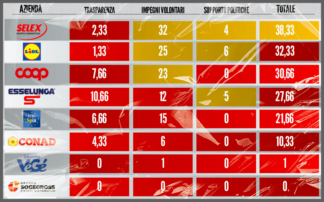 Su 8 catene di supermercati, sette ricevono una valutazione negativa (colore rosso/‘Non ci siamo’). Soltanto Selex, che controlla marchi come Famila, il Gigante, A&O e molti altri, ottiene un risultato intermedio con 38 punti (colore giallo/‘Non è abbastanza’), grazie agli impegni per ridurre la quantità di plastica utilizzata (del 30% entro il 2025) e la volontà di incrementare la vendita di prodotti sfusi o con sistema di ricarica entro il 2025. A seguire troviamo Lidl e al terzo posto Coop, seguite da Esselunga, Eurospin, Conad, Gruppo Végé e Sogegross. Conad, il più grande gruppo operante in Italia, non risponde al questionario e si classifica agli ultimi posti arrivando a circa 10 punti sui 100 disponibili. Le ultime tre insegne in classifica non hanno risposto al questionario e si è quindi tenuto conto delle informazioni disponibili nei bilanci di sostenibilità