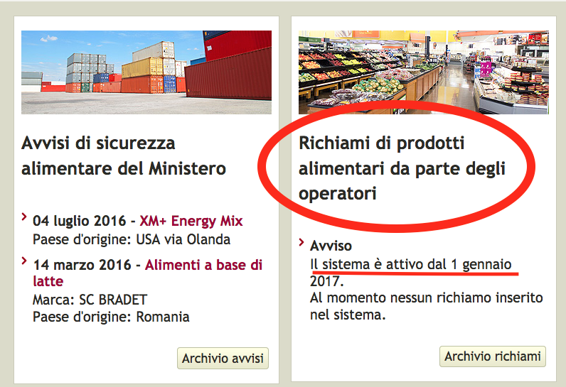 Il giorno dopo la pubblicazione del nostro articolo, la pagina del sito del Ministero dedicata al ritiro dei prodotti alimentari ha pubblicato la notizia di un richiamo