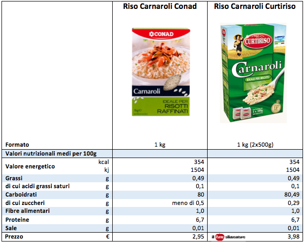 La risposta ci viene fornita dall’azienda: si tratta di riso 100% italiano della medesima provenienza e il prodotto Conad segue lo stesso capitolato di produzione di Curtiriso, quindi la qualità dei due Carnaroli è comparabile. Quella di produrre per la marca del supermercato secondo un capitolato con difettosità ristrette (per quanto riguarda rotture, grani danneggiati o gessati, spuntati, striati rossi ecc.) come si fa per il prodotto Curtiriso, è una scelta dell’azienda.I motivi sono due: da un punto di vista pratico si risparmia nell’approvvigionamento della materia prima che è la stessa, mentre dal punto di vista commerciale, è più facile assicurarsi la produzione per la marca del distributore fornendo un prodotto di qualità pari a quella della marca aziendale.