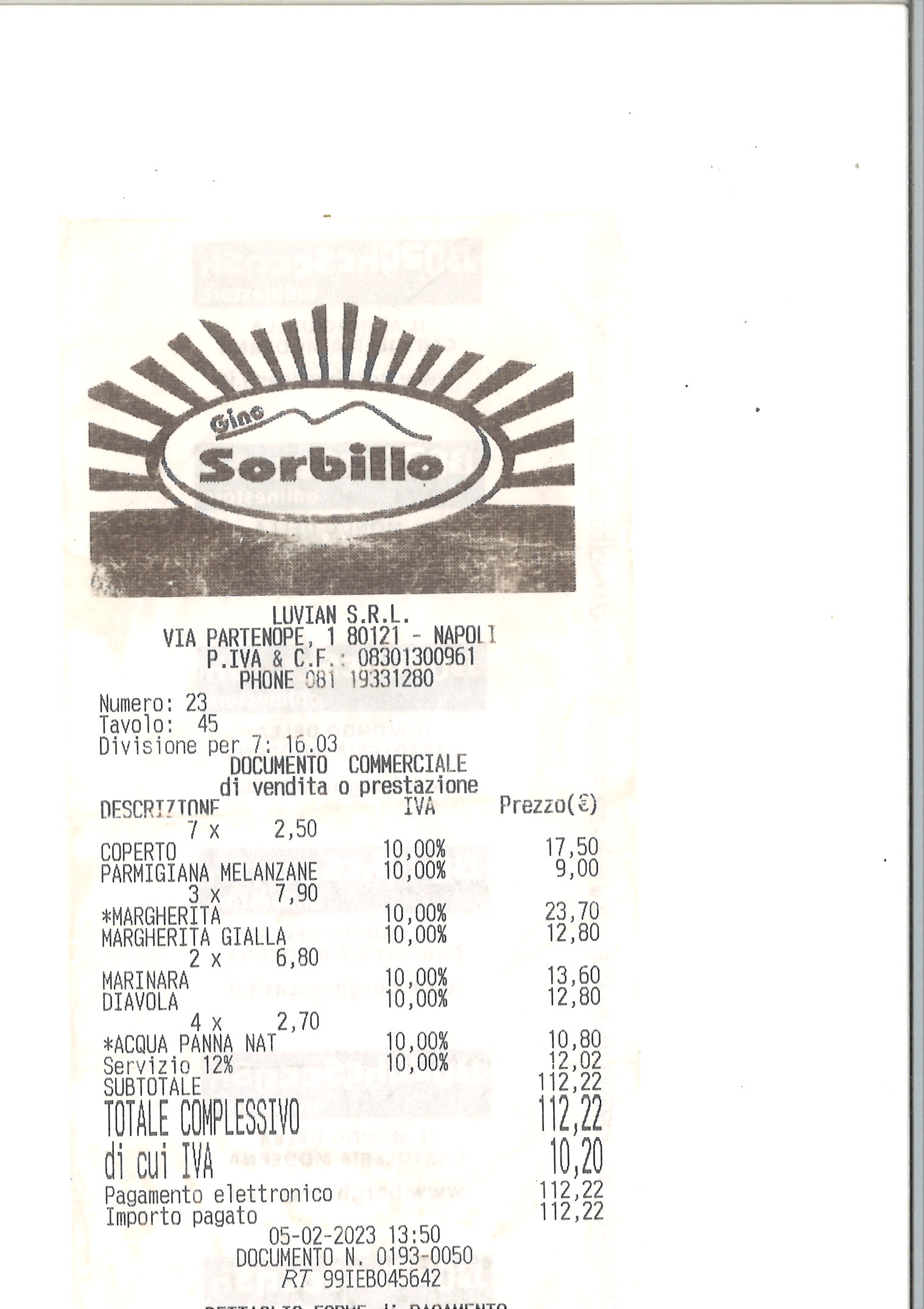 Da Sorbillo, a Napoli, ho avuto un’esperienza davvero spiacevole. Oltre al “coperto” (tovaglietta di carta e posate a 2,50 € cadauno) ho trovato la voce aggiuntiva “servizio 12%” (12,02 €) che non mi è chiaro a cosa si riferisca. Queste “furbate” per turisti le trovo oltremodo stupide e, al tempo stesso, molto tristi