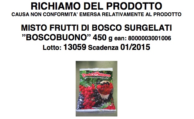 L’allerta (vedi foto a sinistra) riguarda la confezione da 450g “Misto frutti di bosco surgelati BoscoBuono” (lotto 13059, tmc gennaio 2015 codice ean 8000003001006).