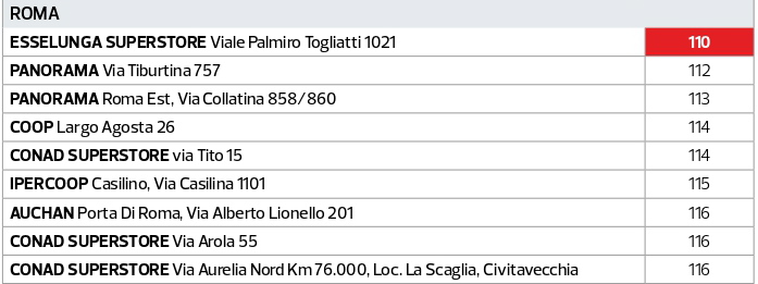 Al secondo e al terzo posto, sui 68 punti vendita analizzati, si posiziona Panorama (via Tiburtina e via Collatina), che anche quest’anno si confermano punti vendita convenienti. I primi posti a parimerito fuori dal podio sono per Coop di Largo Agosta e Conad Superstore di via Tito, con un distacco di quattro punti percentuali dalla posizione numero uno. Seguono in classifica Ipercoop (via Casilina) e, con un distacco del 6% da Esselunga, Auchan (via A. Lionello) e due Conad (via Arola e via Aurelia Nord – Civitavecchia).