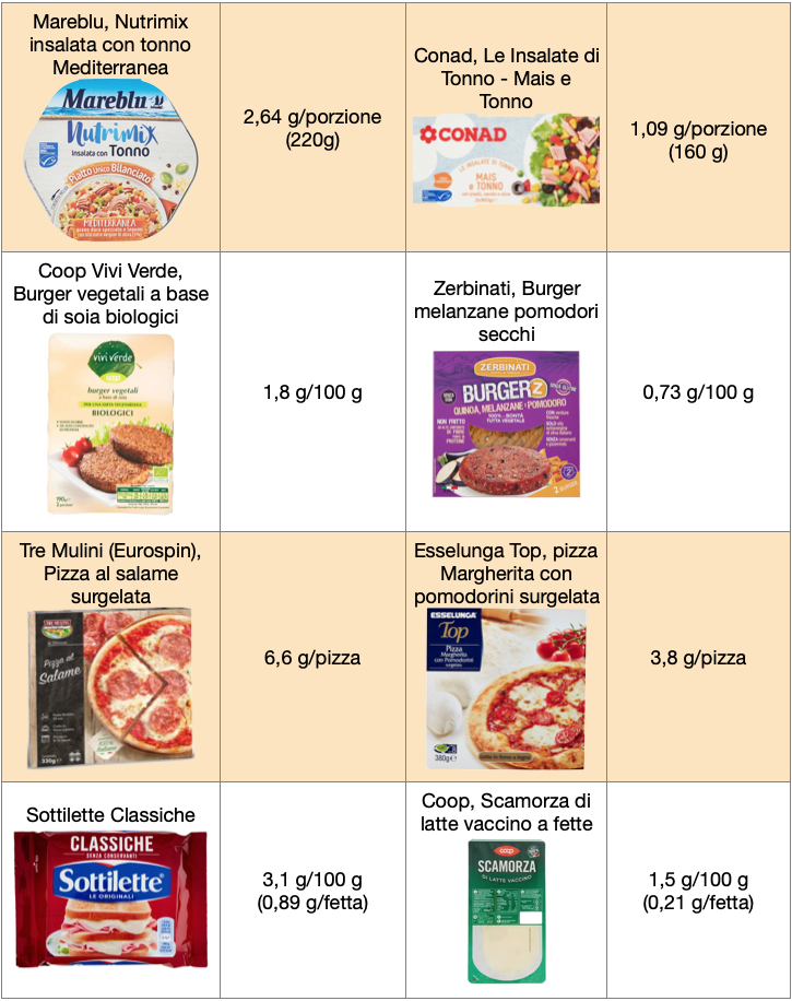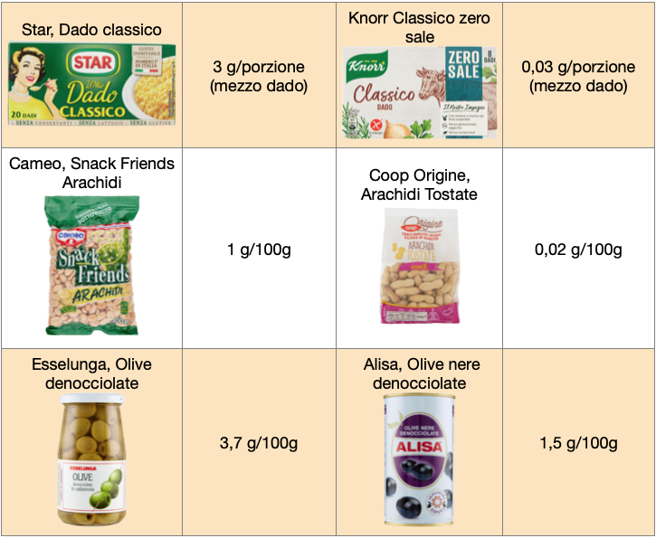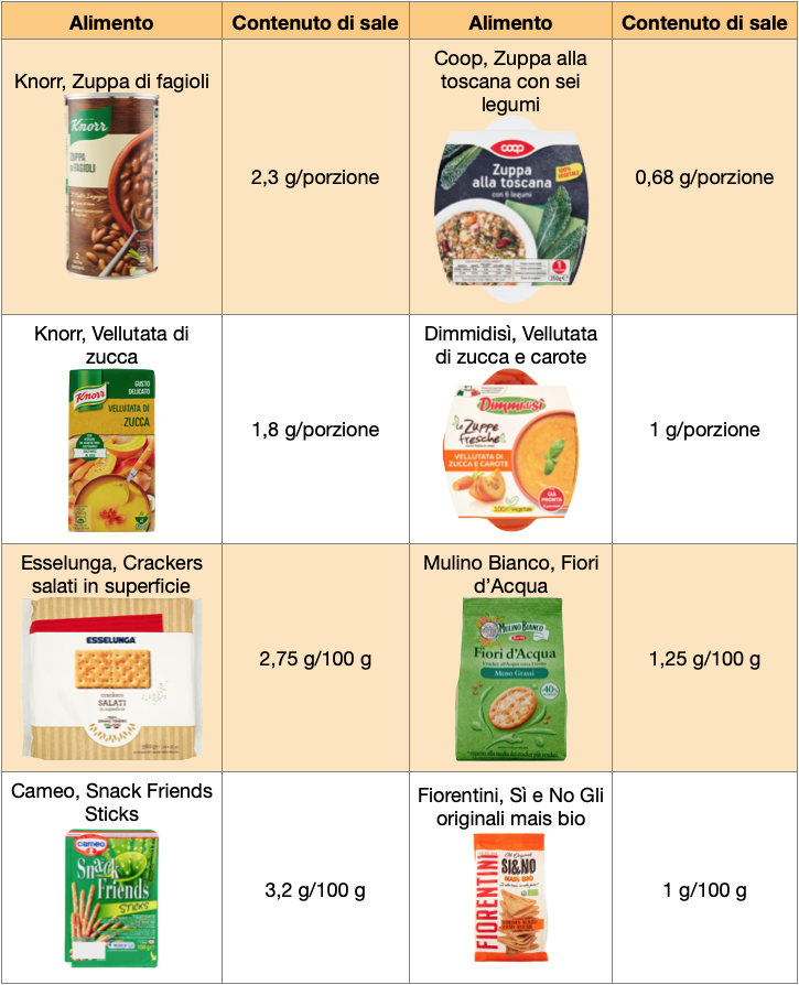 La tabella riporta alcuni esempi di alimenti più o meno ‘salati’ confrontando due prodotti della stessa categoria. Sottolineiamo che non si tratta di giudizi di qualità, ma solo esempi, scelti fra i prodotti dei marchi più diffusi.