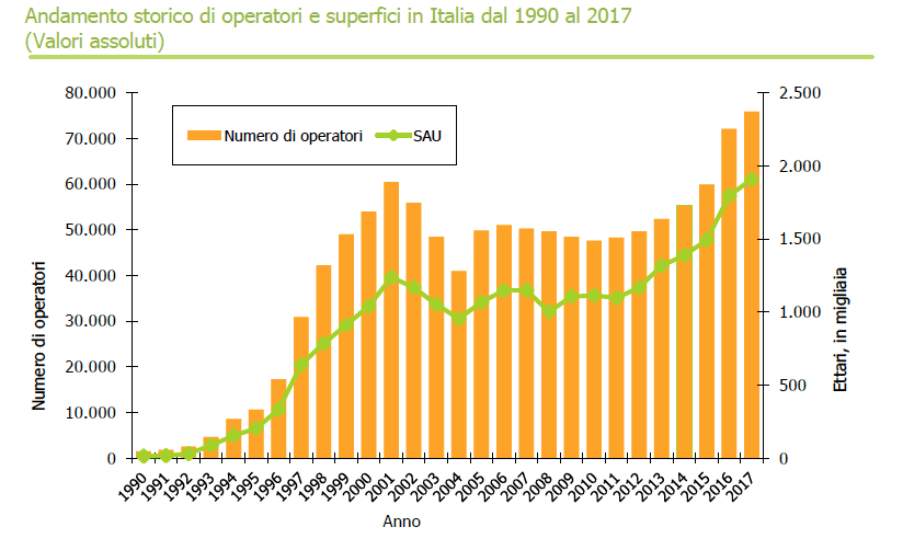 Secondo i dati raccolti dal Sinab, i terreni destinati all’agricoltura (a fine 2017) sono quasi 2 milioni di ettari: il 15,4% della superficie agricola utilizzata. L’incremento è del 6,3% sul 2016 e del 71% rispetto al 2010. Le aziende del settore sono poco meno di 76 mila (+5% sul 2016), rappresentano il 4,5% del totale e hanno un’incidenza più bassa rispetto all’estensione delle superfici, perché le aziende biologiche sono di solito più grandi.