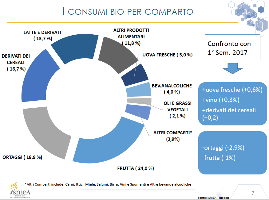 Le regioni con la maggior estensione si trovano al Sud: Sicilia, Puglia e Calabria e ospitano il 46% dei terreni. Le colture principali sono prati a pascolo, foraggere e cereali anche se si registra un forte incremento delle colture più “pregiate”: la superficie a ortaggi cresce del 25% e quella destinata a frutta del 13%. Se confrontiamo il “carrello della spesa” dei prodotti biologici con quello “convenzionale”, i dati Ismea mostrano alcune differenze interessanti. La fetta più rilevante della spesa è destinata alla frutta, con il 24%, seguono gli ortaggi (18,9%), i derivati dei cereali (16,7%), latte e latticini (13,7%). Se invece consideriamo l’incidenza dei prodotti bio in ogni settore, in pole position troviamo le uova (uno su cinque è bio).