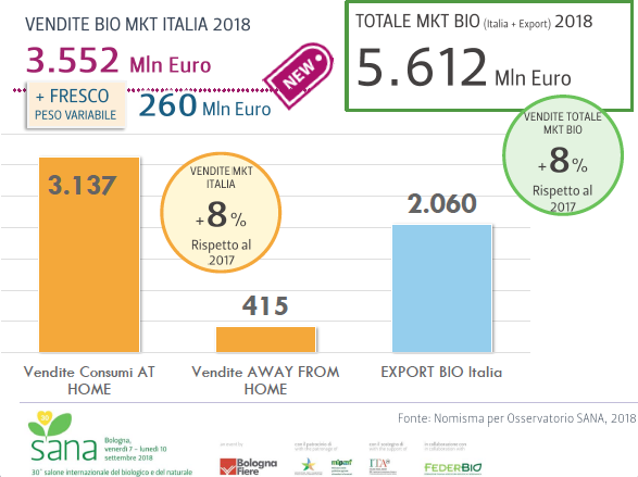 Per comprendere l’andamento dei consumi, è utile soffermarsi sull’analisi presentata dall’Osservatorio Sana di Nomisma. Innanzitutto un dato globale: il valore delle vendite di prodotti biologici in tutti i canali (compresa la ristorazione) considerando l’anno che termina a luglio 2018, è superiore a 3,5 miliardi di euro, con una crescita dell’8% rispetto all’anno precedente. Mentre l’export tocca i 2 miliardi.