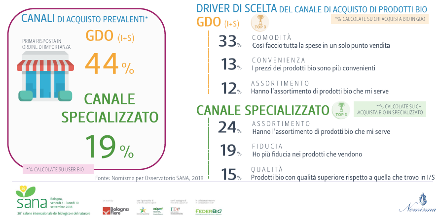 Il principale canale di vendita è la grande distribuzione (iper e supermercati) che ospita il 45% degli acquisti, contro il 24% dei negozi specializzati. Gli affari bio nella grande distribuzione crescono del 14% nel 2018 (sono triplicati se confrontiamo le vendite con quelle del 2010), mentre nei negozi specializzati – unico segno meno del settore – calano del 3%. E questo si spiega facilmente: innanzitutto la politica dei prezzi permette alla grande distribuzione di mantenere prezzi più convenienti. C’è un altro elemento da considerare, negli ultimi tre anni le referenze biologiche nei supermercati sono aumentate: quelle a marchio della catena, in particolare, sono passate da 1858 nel 2014 a 3529 nel 2017. Oltre a soddisfare chi cerca prodotti bio, i supermercati raggiungono un pubblico meno “specializzato”, che trova facilmente alimenti bio sugli scaffali, magari in promozione, e li prova. In questo modo aumenta il numero di famiglie che ogni tanto compra bio. Le interviste ai consumatori di questi prodotti lo confermano: il 44% acquista biologico prevalentemente al supermercato – perché in questo modo fa la spesa in un unico posto – il 19% preferisce invece i negozi specializzati, in particolare per l’assortimento più ricco.