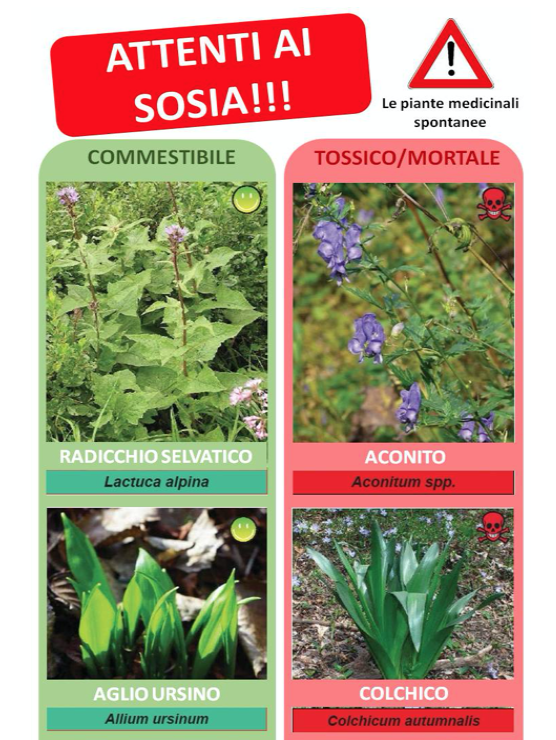 Anche il Centro antiveleni di Milano, l’Ats della Brianza e l’Izler, in collaborazione con il ministero della Salute, la Regione Lombardia e l’Ospedale Niguarda, hanno pubblicato nel 2016 un interessante documento dal titolo “Le intossicazioni alimentari da tossine naturali: guida al riconoscimento e alla prevenzione“. La guida, destinata a cittadini, operatori del settore e studenti, illustra quali alimenti in natura possono essere dannosi per la salute (funghi, piante, pesci, etc), suggerendo come comportarsi in caso di intossicazione oltre alla corretta gestione degli alimenti in ambiente domestico. Nell’immagine sotto ci sono alcune piante tossiche che possono essere scambiate per piante commestibili.