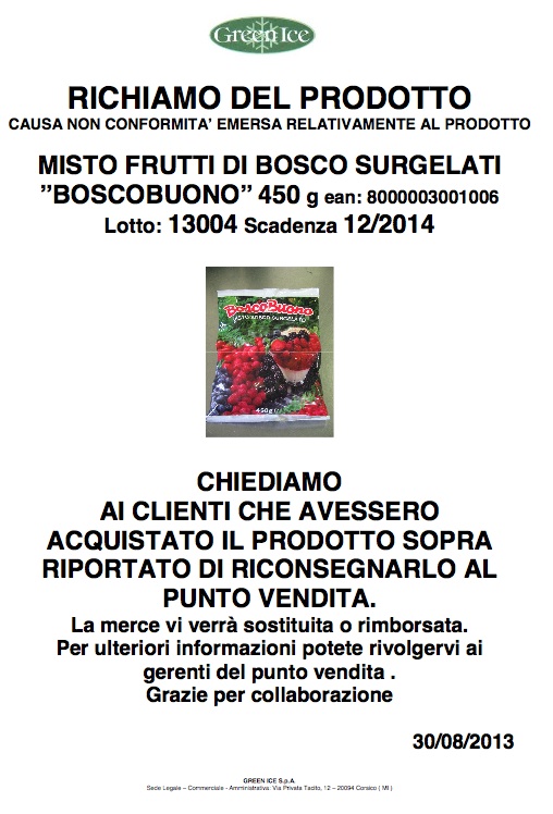 Ciò non toglie che in questi giorni sia scattata un’altra allerta per tre lotti di frutti di bosco surgelati con il marchio “BoscoBuono” prodotti dalla ditta Green Ice, già coinvolta nei ritiri di due mesi fa. Si tratta dei lotti numero 13136, 13129 e 13004.