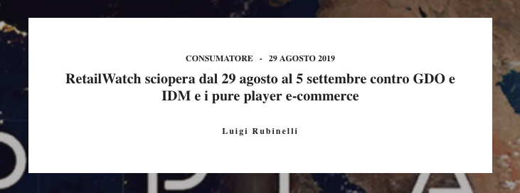 “Abbiamo deciso di fare una settimana di sciopero, dal 29 agosto al 5 settembre, contro le catene di supermercati, l’industria di marca e gli operatori dell’e-commerce come Amazon per protestare contro il mancato decollo delle politiche di sostenibilità ambientale e sociale”. Sono queste le parole scelte da Luigi Rubinelli direttore di RetailWatch, per annunciare la singolare forma di protesta del sito più autorevole e probabilmente più seguito dai direttori marketing e dagli amministratori delegati di queste società.