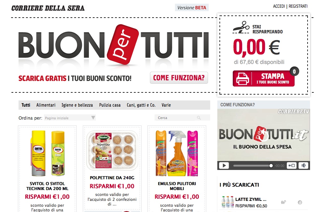 Si chiama BuonperTutti ed è uno degli ultimi siti, a firma del Corriere della Sera, che consente di scaricare buoni sconto. Ha un approccio immediato che permette di ottenere i coupon in tre semplici passaggi. L’impegno è minimo: ci si registra, si selezionano i buoni sconto, si stampano e si usano per fare la spesa. Al termine della registrazione si riceve una e-mail nella quale viene indicato il tetto massimo di risparmio, pari a 75 euro.