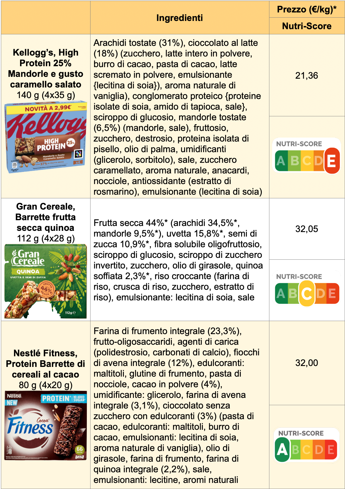 Abbiamo confrontato alcune tipologie viste sugli scaffali dei supermercati, considerando prezzo e profilo nutrizionale. Il confronto stato fatto con l’aiuto del Nutri-Score, sistema che attribuisce agli alimenti un punteggio caratterizzato da una lettera e un colore: da ‘A’ (colore verde inteso) per quelli più bilanciati dal punto di vista nutrizionale, a ‘E’ (colore rosso) per gli alimenti da consumare saltuariamente.